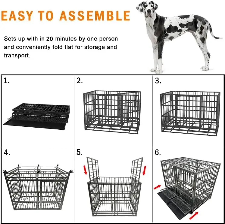 【Spacious Design for Extra-Large Dogs】This 54-inch dog crate provides ample space for breeds over 90 pounds like Great Danes and Mastiffs. Dimensions: 54"L x 36"W x 46"H exterior, with a roomy interior of 53"L x 35"W x 37"H. It supports up to 400 lbs, ensuring comfort for your large pet. 【Superior Strength and Security】Constructed from heavy-duty 20-gauge steel with reinforced 0.6-inch diameter tubes, this crate is chew-proof and escape-proof. It withstands even the most powerful or anxious dogs, offering peace of mind for owners. 【Durable and Rust-Resistant】Made with corrosion-resistant materials and a multi-layer non-toxic coating, this kennel is built to last. It resists rust and wear, keeping your dog safe in various environments. 【Easy Mobility with Lockable Wheels】Equipped with four 360-degree rolling casters (two lockable), you can effortlessly move this heavy crate around your home. Lock the wheels for stable placement when needed. 【Simple Cleaning Features】Includes a slide-out tray under the floor grate for quick cleanup. The grate design allows waste to fall through while providing firm footing for your dog. Both components are removable for convenience. 【Quick Assembly Process】Partially pre-assembled, this crate sets up in under 10 minutes by simply screwing parts together—no tools required beyond what's included. 【Customer Assurance】We prioritize quality and satisfaction. If any issues arise within 30 days of purchase, contact us directly for support to ensure your pet's comfort.