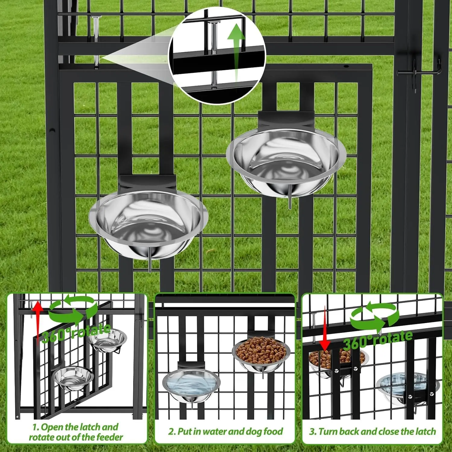 【Enhanced Design for Pet Safety】This outdoor dog kennel features dual rotating feeding doors with lockable mechanisms and two stainless steel bowls, allowing you to securely feed your pets without opening the door. The upgraded construction ensures convenience and safety for your furry friends. 【Robust Construction & Long-Lasting Materials】Built with a sturdy steel tube frame using galvanized technology, this kennel is designed to withstand outdoor conditions. The square steel tubes measure 19mm in side length and 1mm in thickness, with a sandblasted surface for enhanced durability, making it more resilient than many other options on the market. 【Weather-Resistant Cover & Practical Features】Equipped with a removable waterproof tarp made from multi-functional PE material, this kennel protects pets from harsh weather such as heat, rain, or snow. The spire design prevents water accumulation, while the cover resists cracking, peeling, and fading over time for long-term use. 【Secure Wire Mesh & Versatile Applications】The welded mesh wire of this large dog kennel ensures safety by keeping pets secure from external hazards. It is fully welded and coated with PVC after black sandblasting to prevent rust. This versatile enclosure is also suitable for other animals like rabbits, ducks, turkeys, or chickens. 【Easy Assembly & Maintenance】Designed with tube insert installation and snap-pin parts for quick assembly, this dog run saves time during setup. Detailed instructions are included in the package along with an on-site video guide for assistance. It can be easily cleaned with water to maintain hygiene and promote pet health.