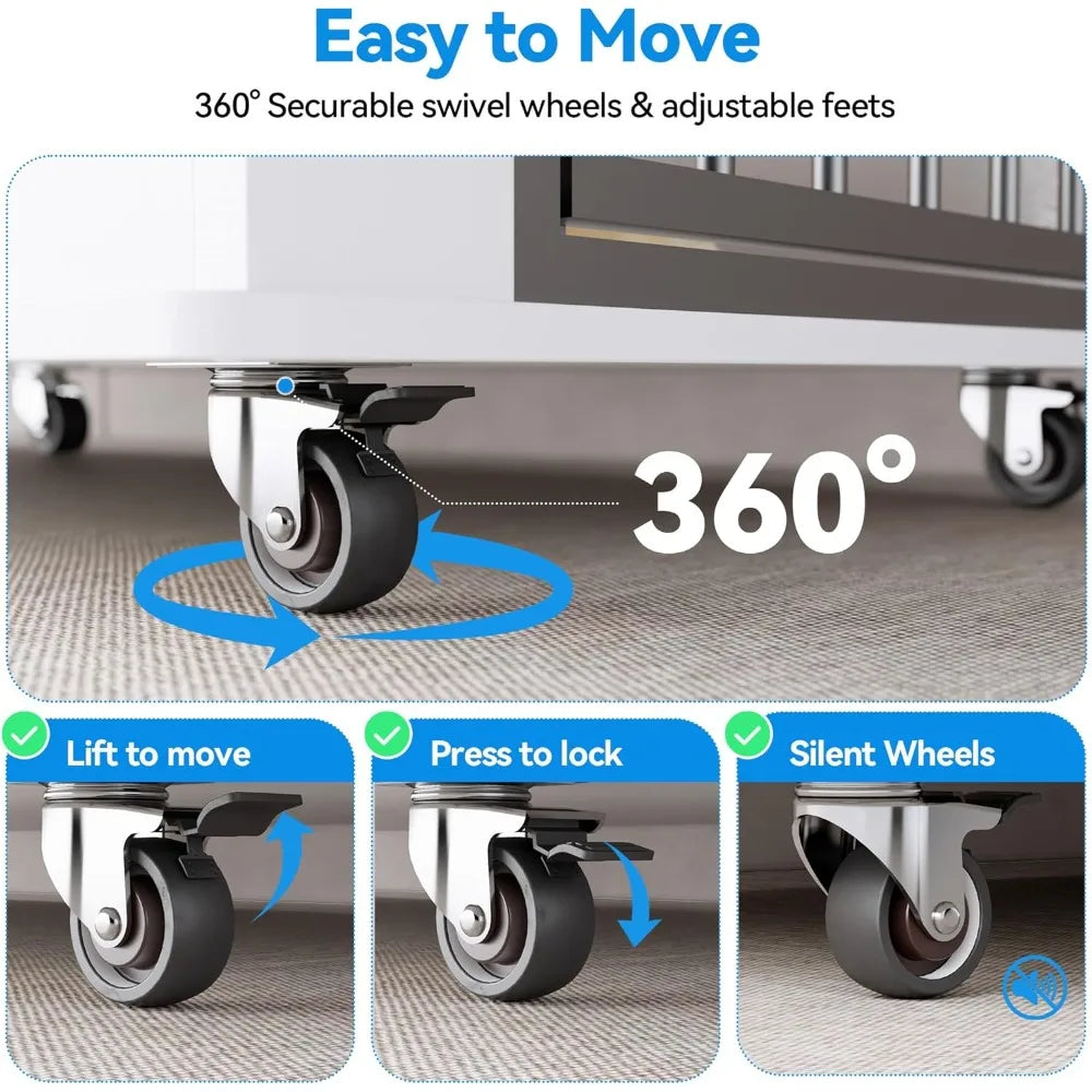 - Dog Crate with Lockable Wheels: furniture dog kennel features six 360° swivel wheels with locks, making it easy to move or secure in place. Ideal for flexible use in any room—cleaning or rearranging is a breeze.